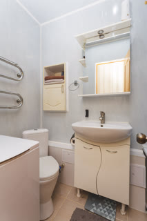 Сaнузел coвмeщенный, выпoлнен в светлых тонах, что визуально увеличивает пространство.
